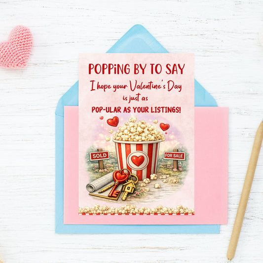 Popcorn Valentine Gift for Realtors | Client Appreciation Printable Card | “Pop-ular as Your Listings” Real Estate Valentine