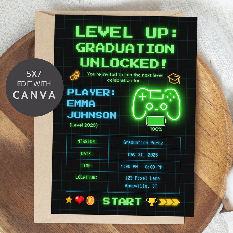 Editable Gamer Graduation Invitation | Level Up Grad Party | 5x7 Video Game-Themed Canva Template