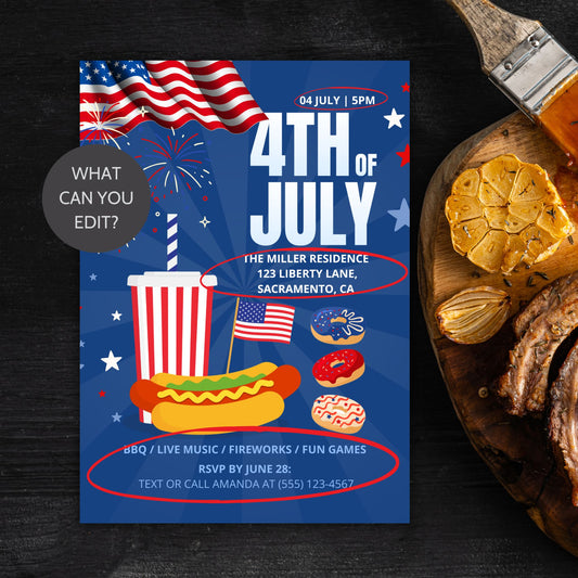 Editable 4th of July BBQ Party Invitation | 5x7 Canva Template | Patriotic Fireworks Cookout Invite | Printable PDF Download