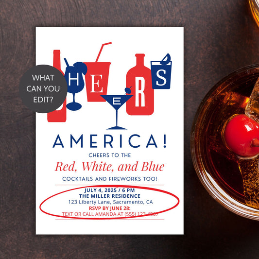Editable 4th of July Cocktail Party Invitation | Red White & Blue 5x7 Canva Template | Cheers to America | Printable Download