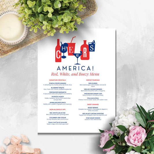 Editable 4th of July Boozy Menu | Red, White & Booze Cocktail Sign | Instant 8.5 x 11 Canva Template | Cheers to America Menu