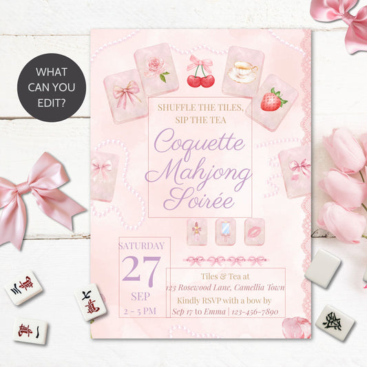 Editable Coquette Mahjong Soirée Invitation 5x7 | Pastel Mahjong Tea Party Invite | Canva Template