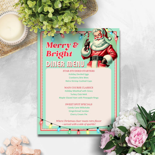 Merry & Bright Diner Menu Template | Retro 1950s Christmas Menu | Editable 8.5x11 Holiday Dinner Word File