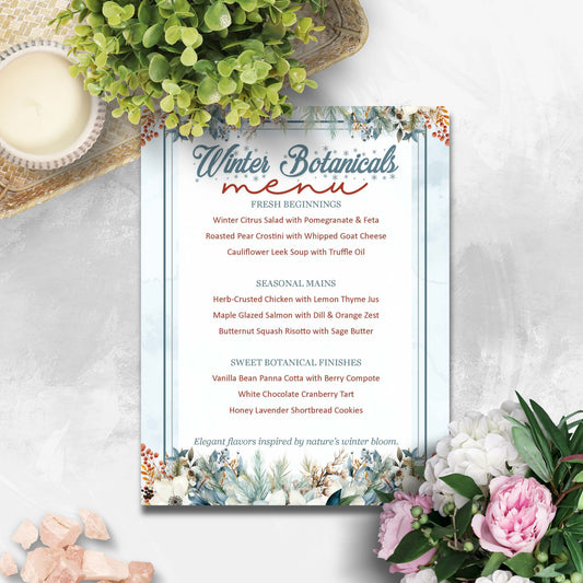 Winter Botanicals Editable Holiday Menu | Elegant Greenery Christmas Dinner Menu Template | Printable 8.5x11 Word Document