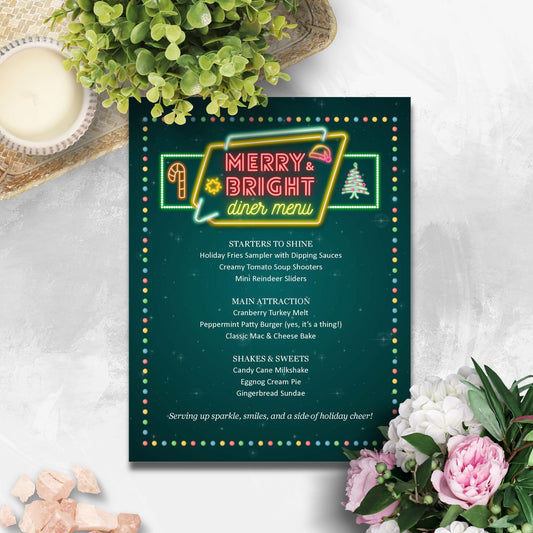 Merry & Bright Diner Menu Template | Retro Neon Christmas Menu | Editable 8.5x11 Holiday Dinner Menu Word File