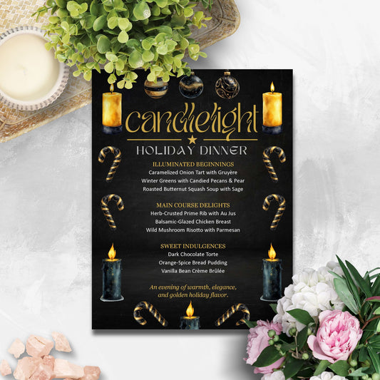 Candlelight Holiday Dinner Menu Template | Elegant Black & Gold Editable Christmas Menu | Printable 8.5x11 Word File