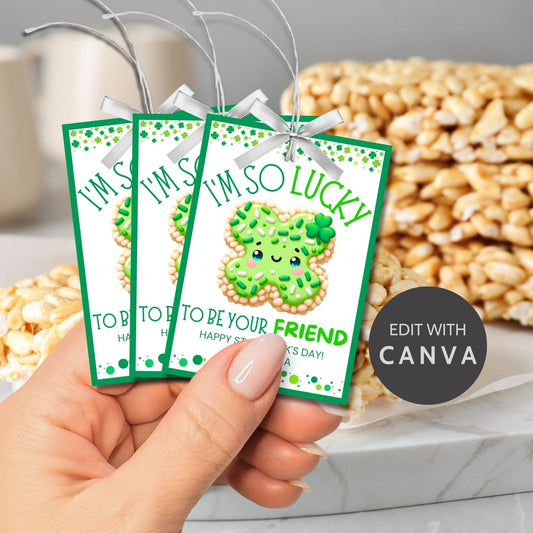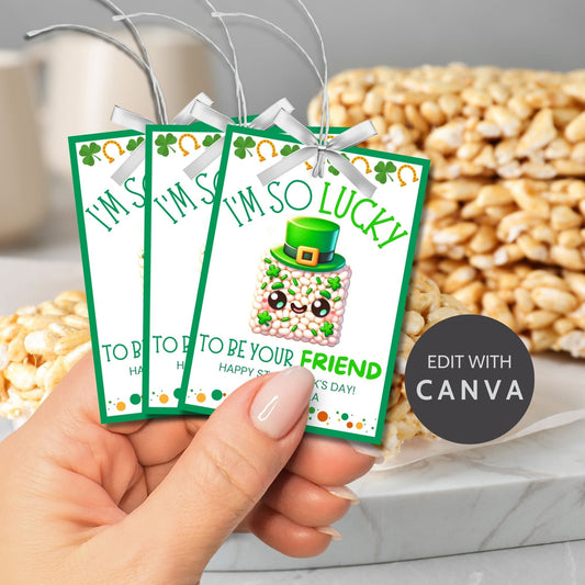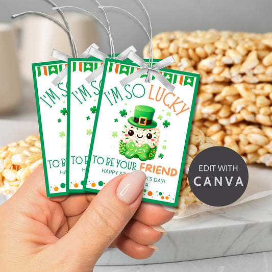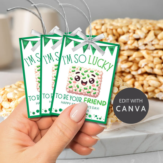 Rice Krispy Crispies Treat Printable Editable Gift Tag Girl Boy Snack Bars Clover Classmate Classroom Employee Staff Coworker Friend Client