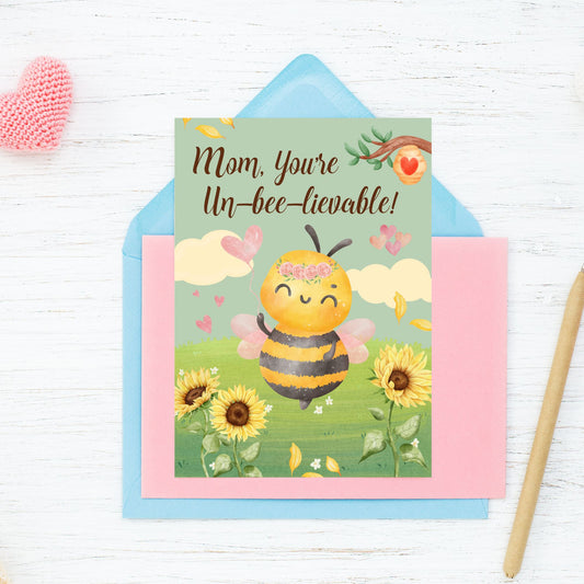 Mom, You’re Unbeelievable – Printable Mother’s Day Card | 5x7 PDF, Instant Download | Cute Bee Pun Greeting Card | Given Crafted Wonders
