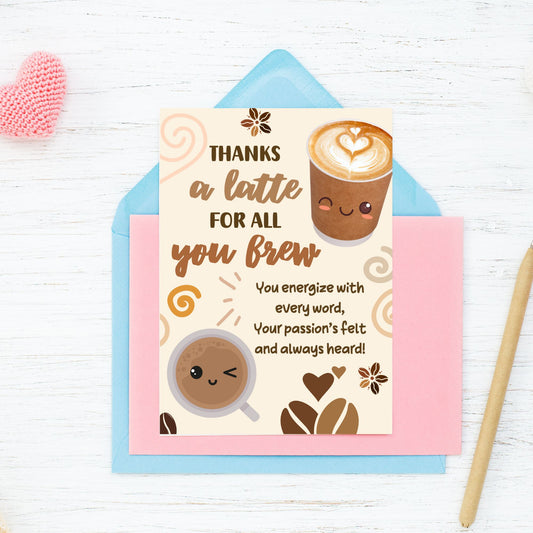 Printable Teacher Appreciation Card – “Thanks a Latte for All You Brew” | 5x7 Coffee Gift Idea PDF | Given Crafted Wonders