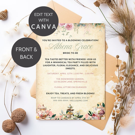 Vintage Botanical Tea Party Invitation | Editable Canva Template | Elegant Floral Bridal Shower & Birthday Invite | Given Crafted Wonders