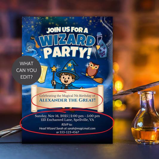 Editable Wizard Birthday Party Invitation Template 5x7 for Kids | Magical Canva Theme