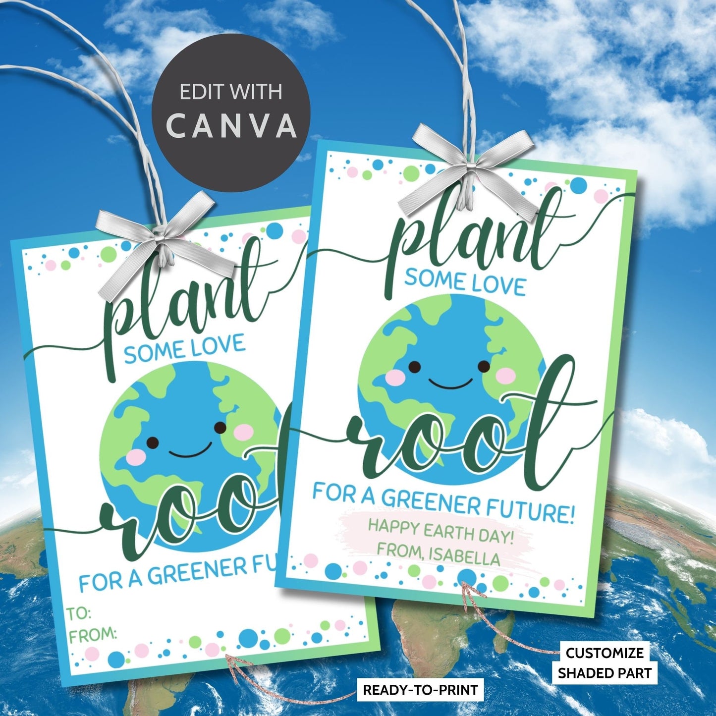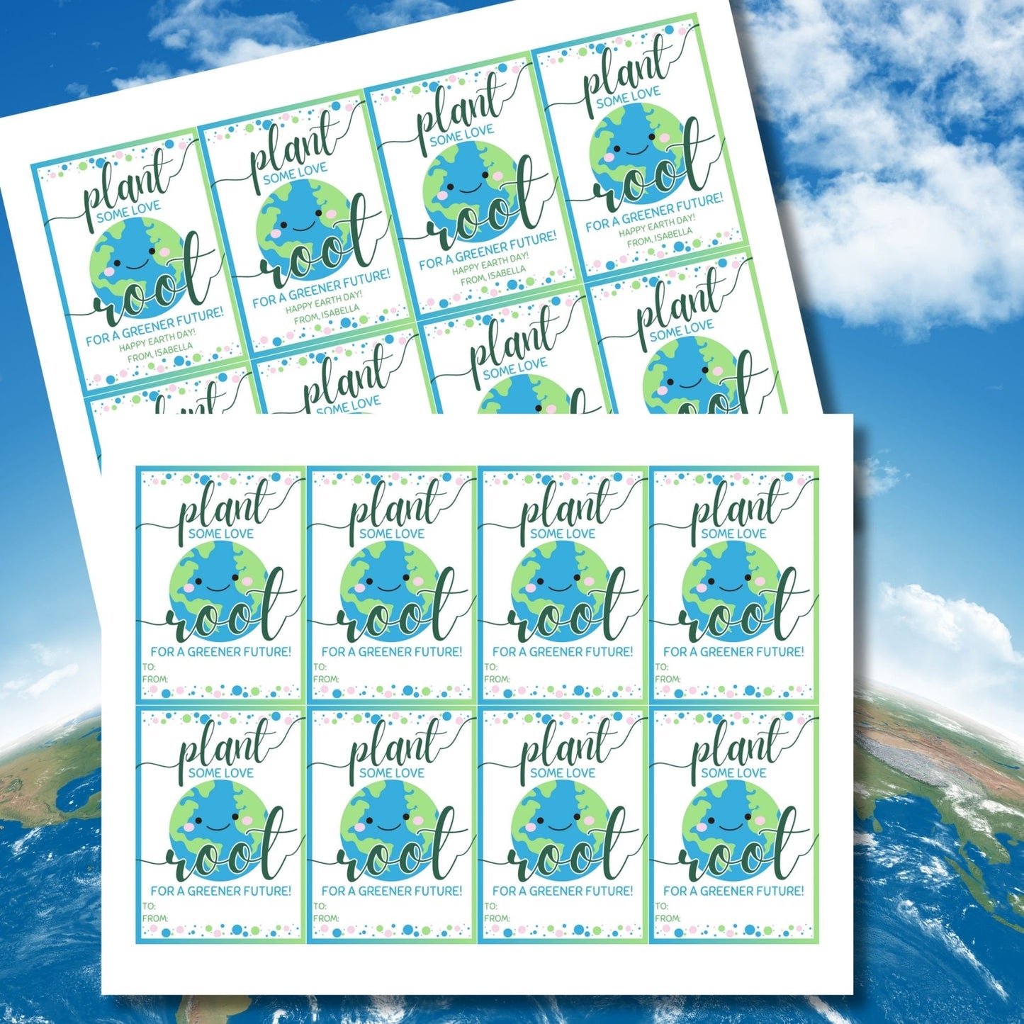 - A ready-to-print favor tag adorned with an adorable smiling Earth, surrounded by a constellation of cute bubbles, all tied together with the sweetest message, "PLANT SOME LOVE! Happy Earth Day!" πβ¨