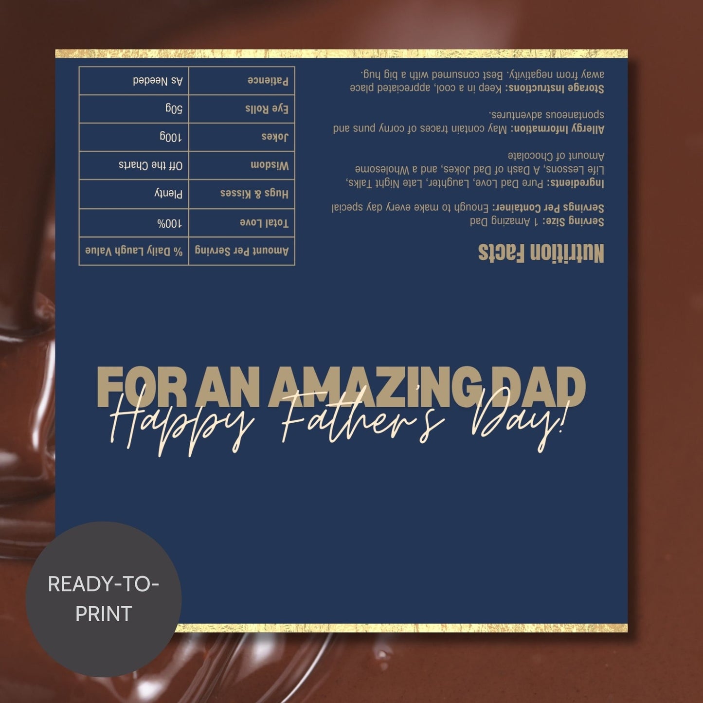 π Wrap up your love for Dad with this **Stunning Father's Day Chocolate Bar Wrapper!** π« Transform an ordinary chocolate into a heartfelt gift that says, "For an Amazing Dad! Happy Father's Day!" The perfect size for standard chocolate bars, this elegant navy and gold wrapper is ready-to-print, measuring 5.5 x 5.6 inches. Ideal for a last-minute, yet memorable, surprise that will make Dad's day extra special. ππ