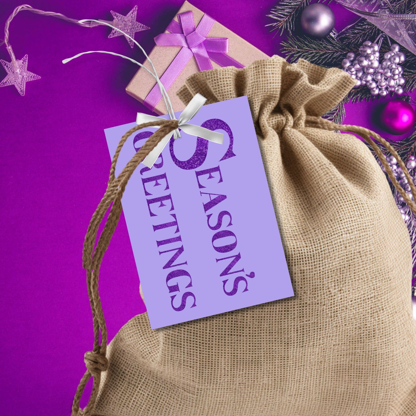 Featuring shimmering purple glitter text on a soft lavender background, these tags create a magical and regal holiday look. With festive messages like "Merry and Bright" and "Season's Greetings," these tags are perfect for adding a unique and vibrant touch to your gifts.