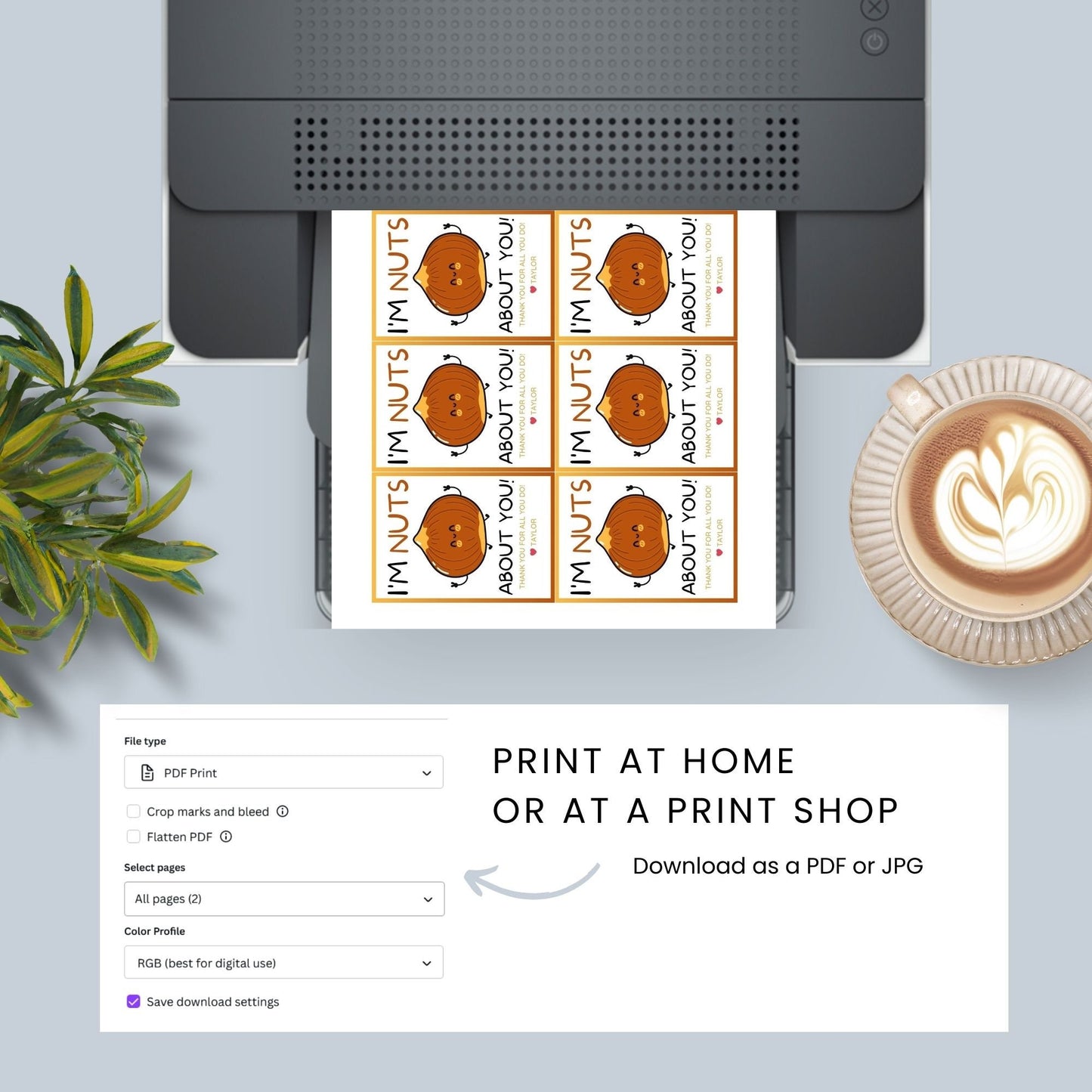 🌰💖 **Go Nuts with Appreciation!** Show how much you care with these adorable "I'm Nuts About You!" gift tags, perfect for anyone who deserves a little extra gratitude—teachers, nurses, employees, bus drivers, and more! This charming set includes 📄 two PDF files: one ready-to-print, so you can instantly start spreading joy, and one with a link to an editable template in Canva, allowing for easy name customization. 🖨️✍️