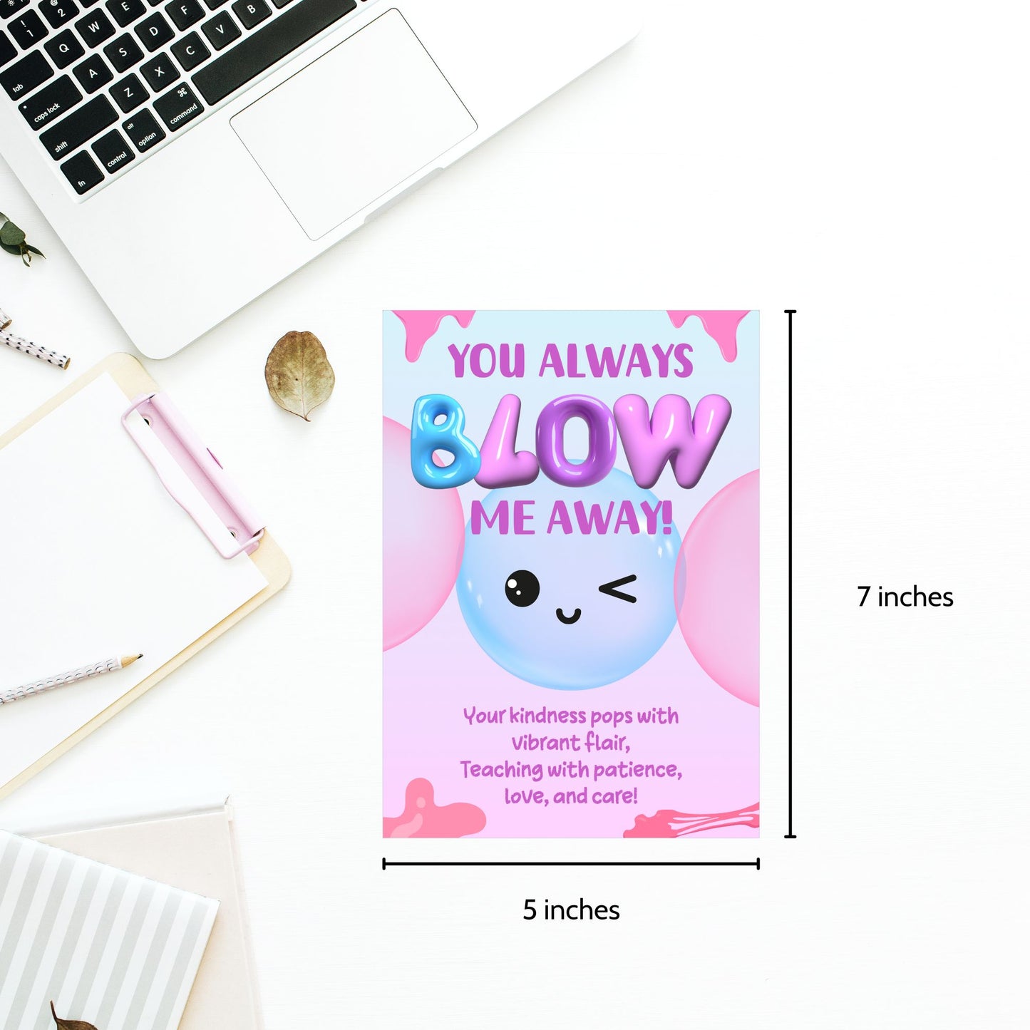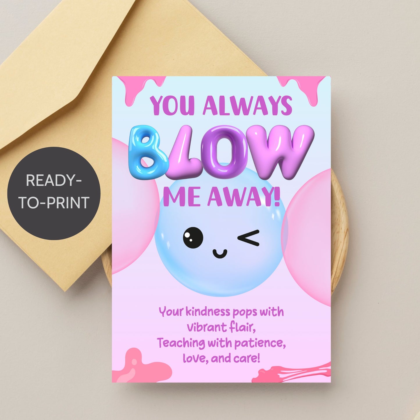 "You Always Blow Me Away" Printable Teacher Appreciation Card – 5x7 Gum or Bubble Gift PDF | Given Crafted Wonders